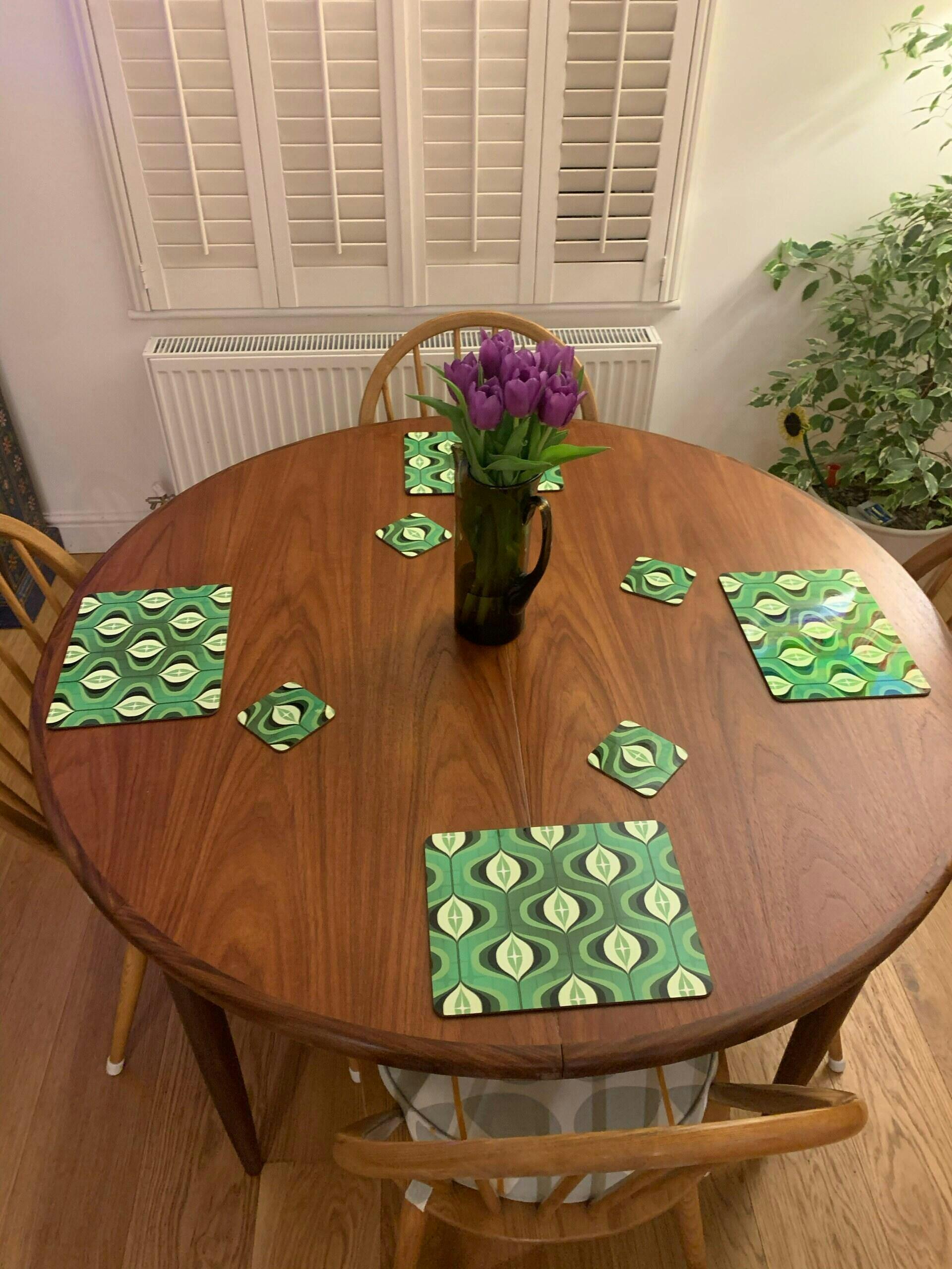 Our 1970s Op Art inspired placemat and coaster set, in gorgeous greens, will bring fabulous retro chic to your dinner table. Vintage style which will look great in retro and modern homes alike!